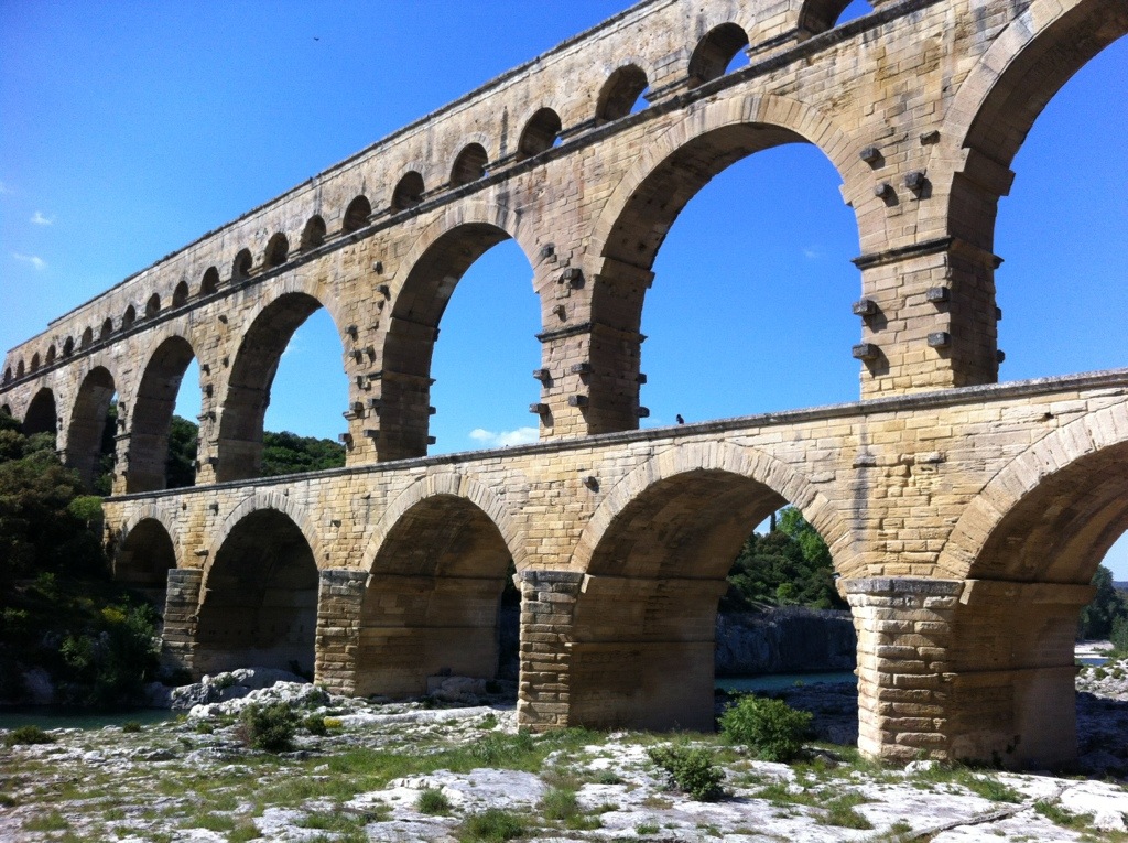 I’m always aware of the largeness of Time here. In California, The oldest buildings are the Missions, from the 18th Century. Here, of course, it goes so much farther back. We went down below the street level in Arles and saw the superstructure built by the Romans to support the Forum. It was a basement the size of a parking garage. Today we visited the Pont du Gard, the Roman aqueduct outside of Avignon. Our hotel is new, in an office park, outside of Aix, and five minutes down the road is a one-way Roman bridge over a stream. I’m going to be crossing lots of those bridges on foot in Spain. One of my hopes for the Camino is to enjoy the time with the deeper appreciation of living in Time.