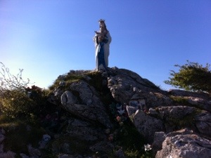 Here’s a sampling of my photos from my second day on the Camino. So much happened yesterday,it was like 72 hours rather than 24. The day began at 7:00 at Orisson with bread and butter, and bowls of coffee. We set off on the path, and headed up and up, one Peregrino at a time. Solitude and quiet. Flocks of sheep and wild ponies, (and baby ponies) The wind came over the ridge of the Pyrennes and hit us straight in the face. I hiked by myself for much of the morning, working hard with the hiking poles. It was exciting to see the landmarks I’d read about in the Brierely guidebook: the Virgin overlooking the vast valleys of the Pyrennes, the outcroppings of rocks, the windswept cross. It seemed higher than 3,000 feet, with the wind and the snow off in the distance. Near the top an enterprising shepherd set up a food truck and that was the first place I experienced the gathering of
