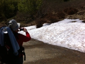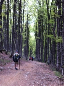 the Pilgrims taking a break. Many of the Orisson folks were there, and pilgrims who started early that morning in St. Jean, too.The guy at the food truck gave out the last stamp in France. Then, up and over a Col, or peak, the path came down and we entered Spain by going over a cattle grate. The Fountain of Roland, an overflowing spring, right before the Border, was much more impressive than the border itself. I had such a sense of walking in the footsteps of history. Roland, pilgrims, and Napolean took the same route into Spain. I walked with several people, and walked most of the afternoon with Monika from Austria and Ernesto from Indiana, who were both about my age. The terrain became wooded, and then we climbed even higher and walked next to snow fields. Then the descent into Rencevalles began, a long steep downhill through a forest. I couldn’t have done the up or the down without the poles. When we got to Roncevalles, we sat in the sun and had a beer and celebrated our arrival. Six hours, and a once in a lifetime journey, that had only just begun.