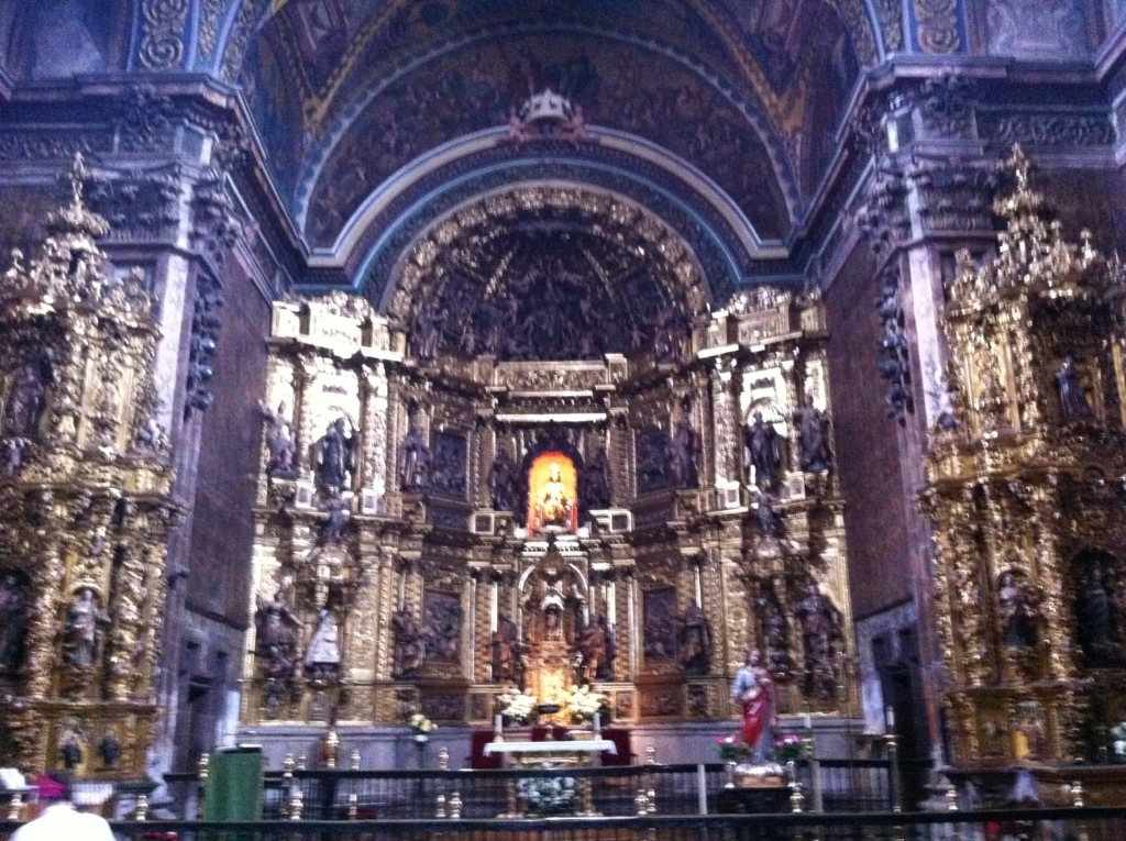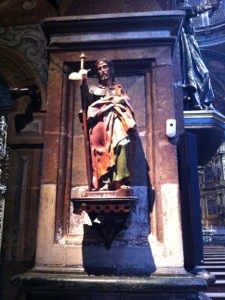 The countryside is punctuated with ancient churches. Today my pilgrim buddy, Caroline and I bussed to Los Arcos from Estella, to give our bodies a break. (20 minutes to cover 22 kilometers vs. about 5 hours at my good pace. We walked into the church, which looked semi-impressive on the outside, and my jaw dropped. Overwhelmingly beautiful. Cloisters attached. Sometimes Spain just brings tears to my eyes. We’re going there for pilgrim Mass this evening, and another pilgrim blessing. There’s St. James again!